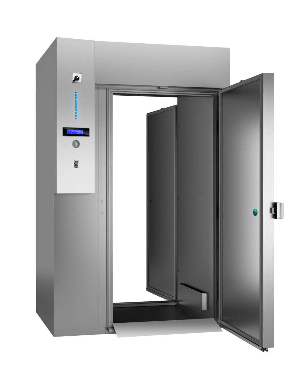 Interior / exterior em aço inoxidável AISI 304. 20 niv.GN 2/1 e EN 80×60 cm.Produção: refrigeração 210 kg; congelando 144 kg.Controlos de cartões LCD + codificador, multilíngue, refrigeração IFR, programas especiais, incluindo Infinity, Smart on, Multy … e funções de descongelamento, conservação … MSG LED.Double door a / surété int. Modelo sem grupo Geladeira para refrigeração remota.