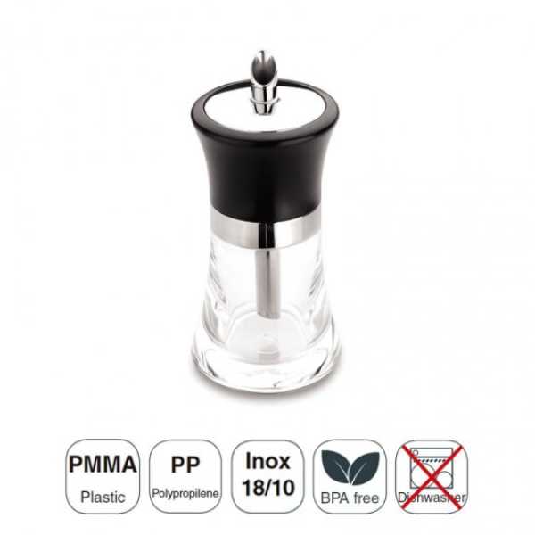 Açucareiro de plástico livre de bisfenoles de 7 cm de diâmetro e 12,5 cm de altura, com tampa de polipropileno e aço inoxidável 18/10.