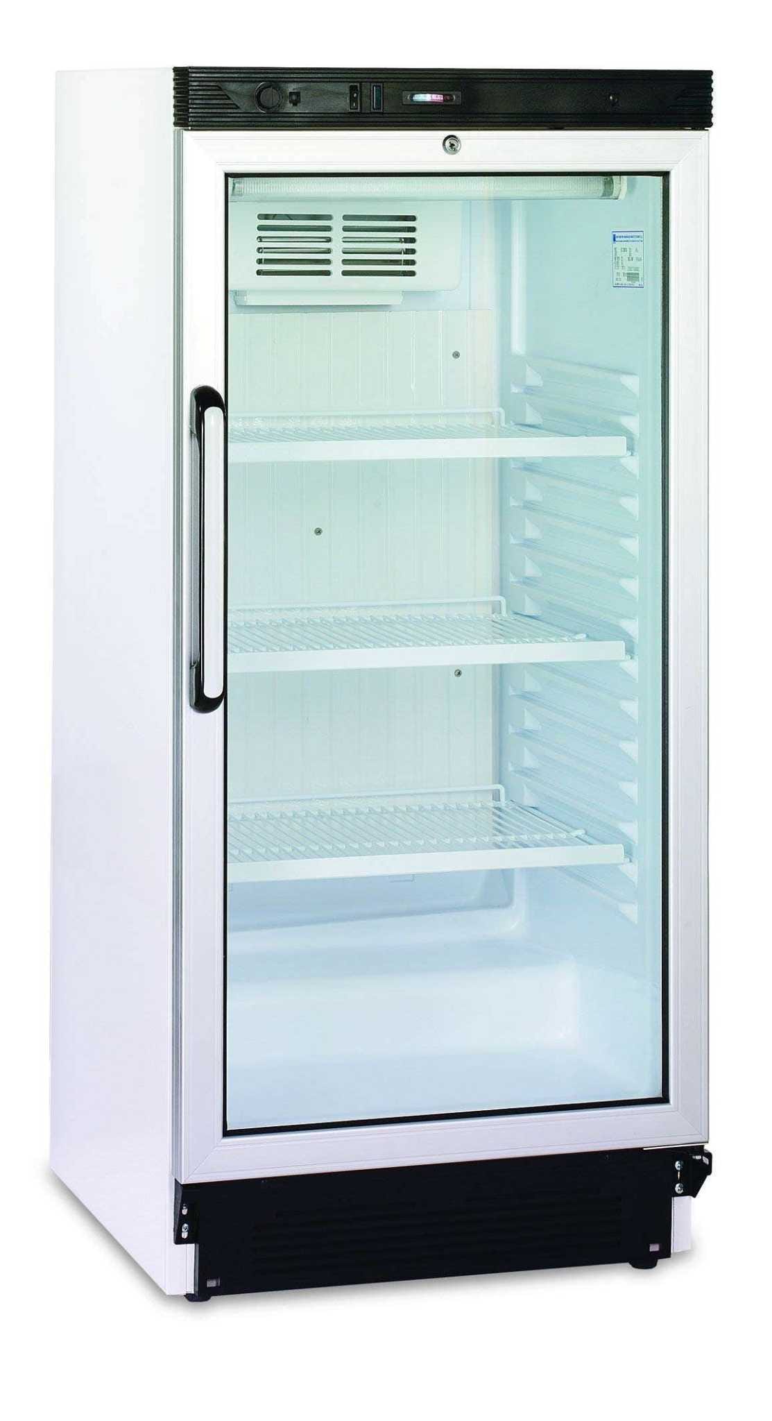 Armário vertical de conservação sem display; Com porta de vidro; Descongelação automática; Refrigeração ventilada; com 3 grelhas incluídas;