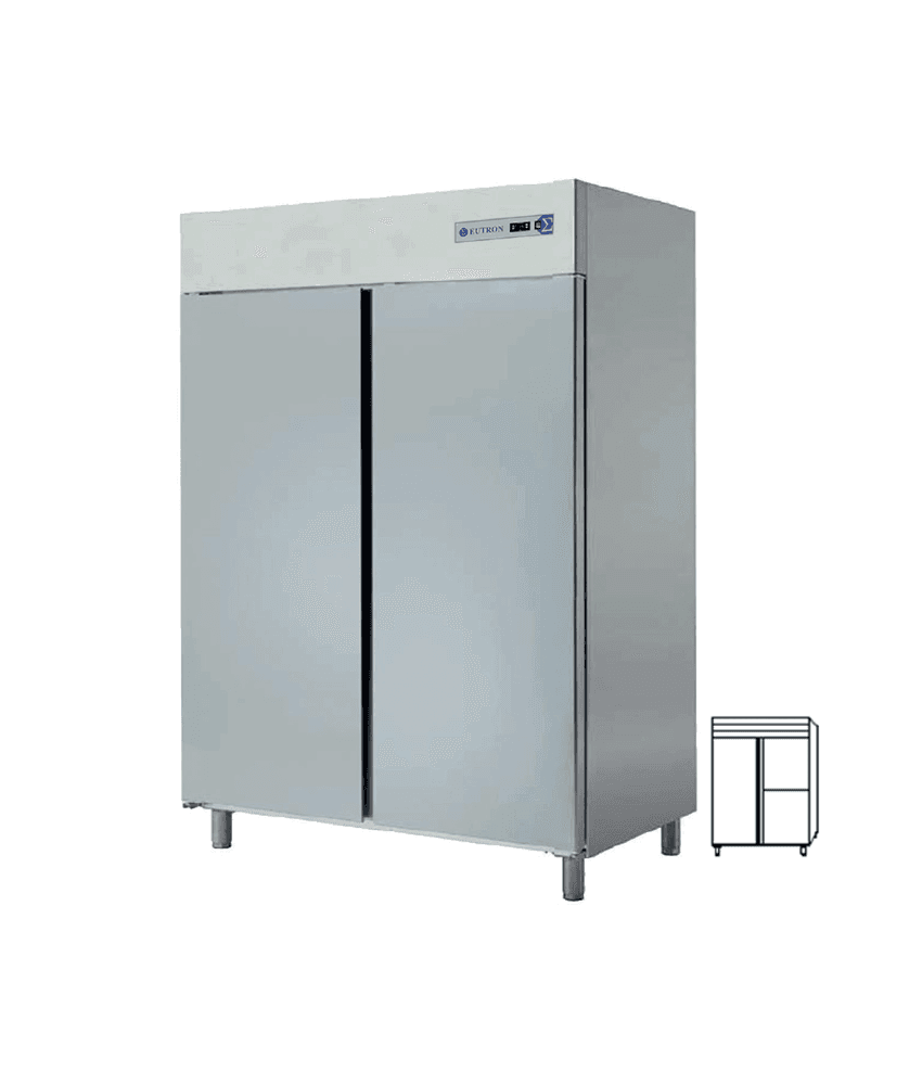 Armário vertical refrigerado com estrutura exterior e interior em aço inox, 2x 1/2 + 1 portas de abrir opacas em aço inox, prateleiras GN2/1 ajustáveis em altura, pés niveladores em aço inox, termostato digital, temperatura interior de +2ºC a +8ºC