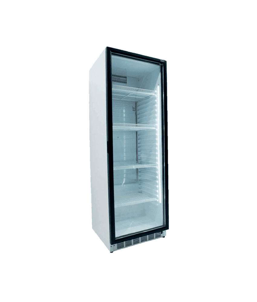 Armário vertical refrigerado com porta em vidro, a solução ideal para exposição de bebidas e alimentos.
