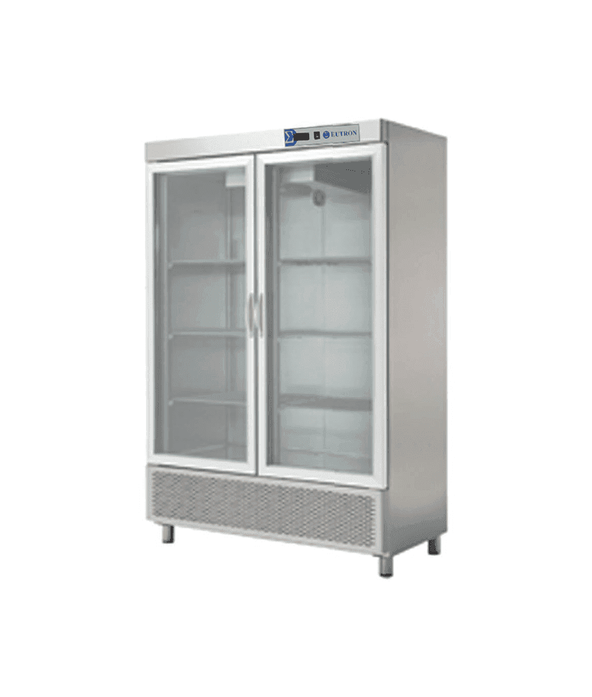 Armário vertical refrigerado com estrutura exterior e interior em aço inox, 2 portas de abrir em vidro, pés niveladores em aço inox, termostato digital, temperatura interior de -2ºC a +8ºC à temperatura ambiente +38ºC.