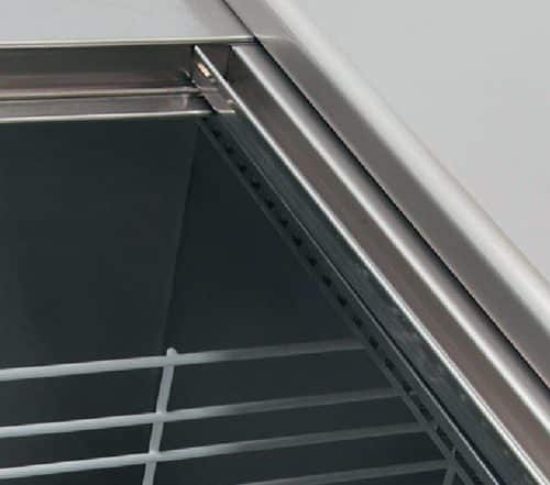Portas de correr com puxador incorporado, injectado, com a parte superior em aço inoxidável acetinado e a parte inferior com uma porta traseira em termoplástico que funciona como uma barreira térmica