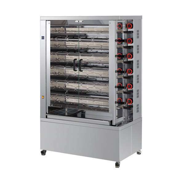 Assador de frangos vertical, equipado com resistencias elétricas de grande potência protegidas com cristal vitrocerámico para facilitar a limpeza.