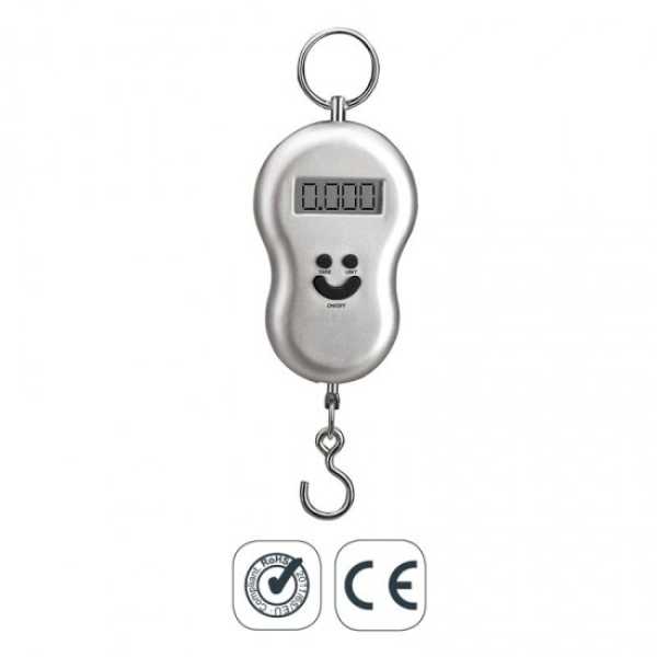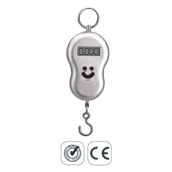 Balança com o gancho para fazer medições de até 10 kg com divisão de 5 gramas.