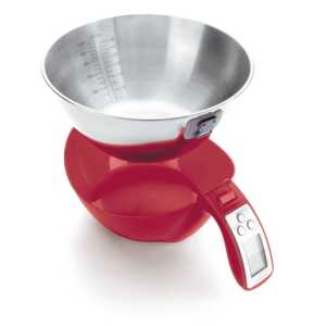 Balança para 5 kg digital com teclado, monitor e tigela removível de aço inoxidável de 21 cm de diâmetro e 1,5 l de capacidade.