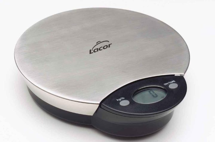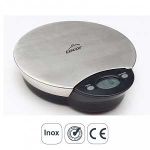 Balança eletrônica para 5 kg com divisão de 1 g, fabricada em aço inoxidável e display digital com desligamento automático.