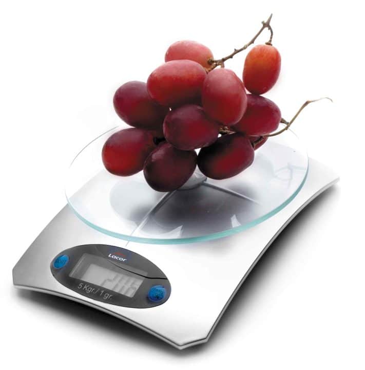 Balança digital de mesa para 5 kg, com divisões de 1 grama com acabamento metalizado e base de vidro.