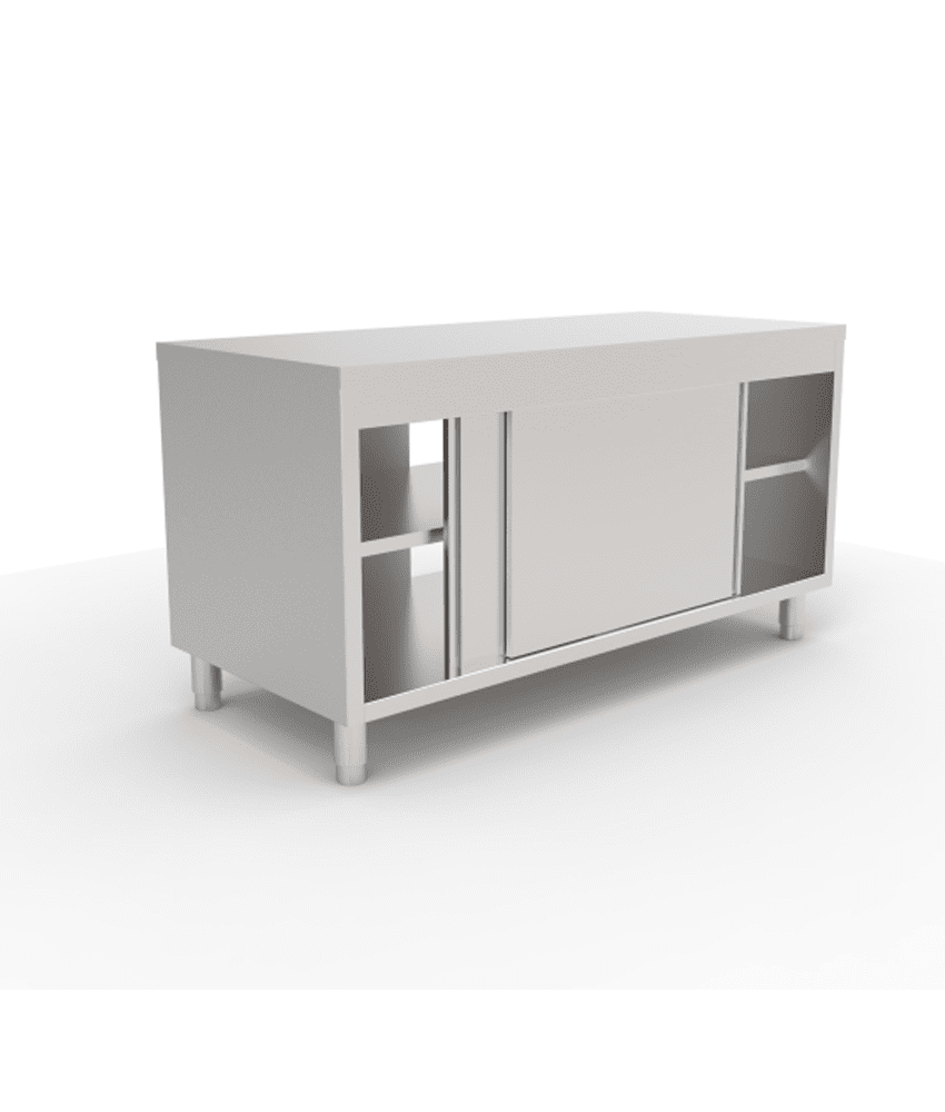 Bancada armário em aço inox AISI 304, com portas deslizantes dos 2 lados, prateleira inferior e intermédia.