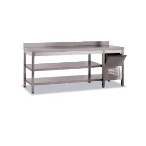 Bancada de cafetaria em aço inox AISI 304 com alçado posterior, tulha para borras de café, prateleira inferior e intermédia.