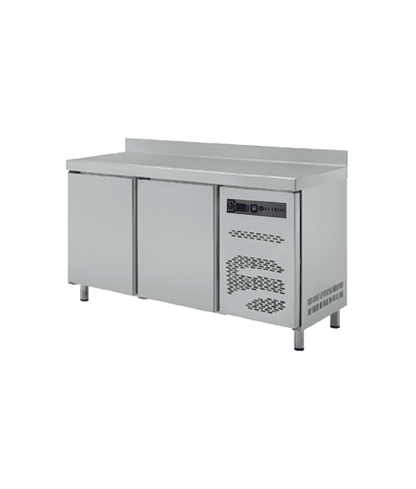 Bancada para conservação de congelados, com estrutura exterior e interior em aço inox, interior com cantos arredondados para fácil limpeza, 2 portas aço inox com sistema de retorno automático, pés em aço inox reguláveis em altura, evaporação automática da água de descongelação, termostáto digital e temperatura interior -18C a -20ºC à temperatura ambiente +38ºC.