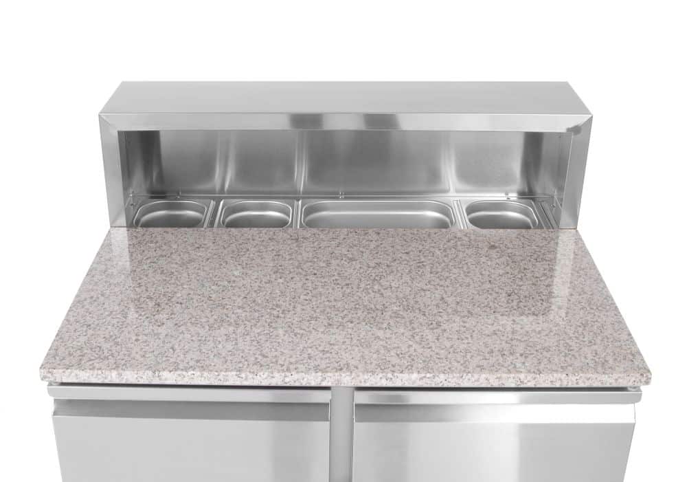 Com cobertura em aço inoxidável à volta do espaço GN, onde cabem 5 recipientes GN 1/6 (altura máx. 150 mm).