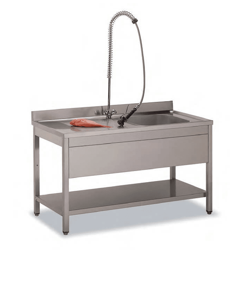 Bancada lavadouro em aço inox AISI 304 com 1 cuba do lado direito ou esquerdo e prateleira inferior.
