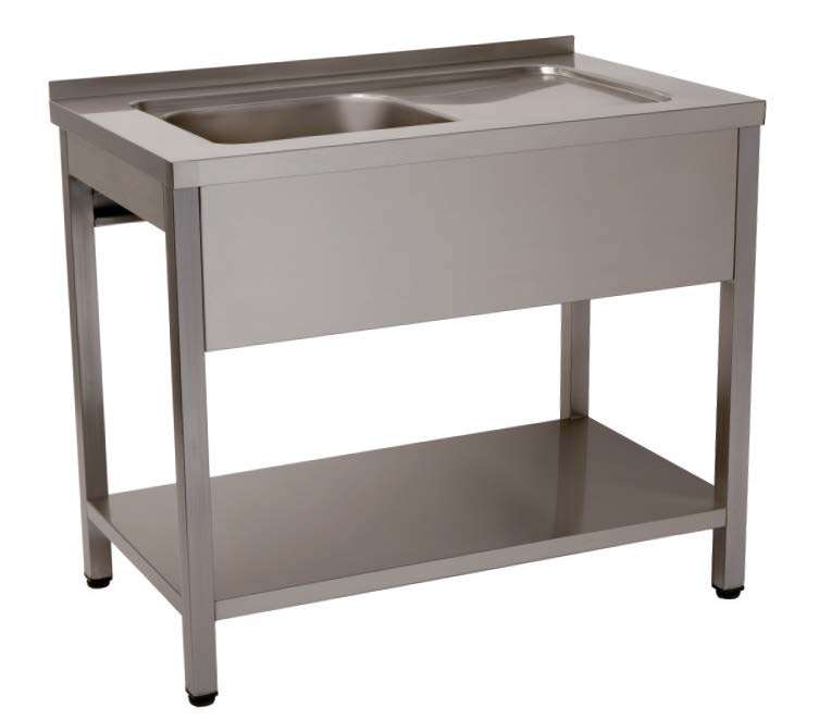 Bancada de lavagem em aço inox com uma cuba, desmontada.
