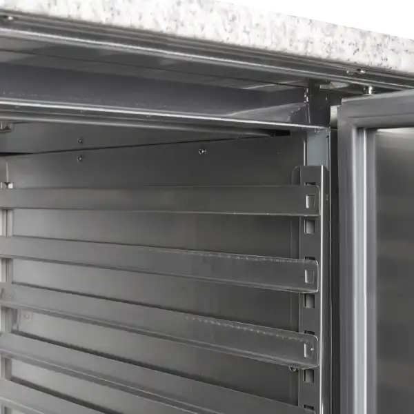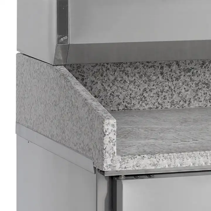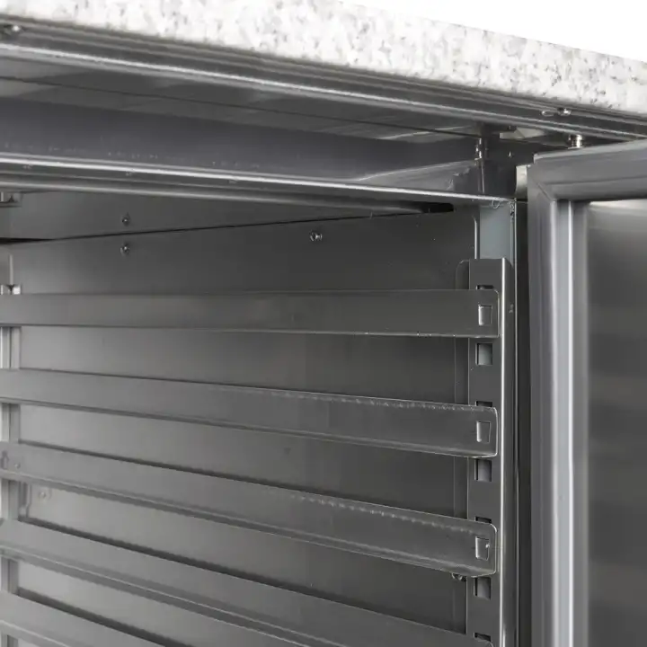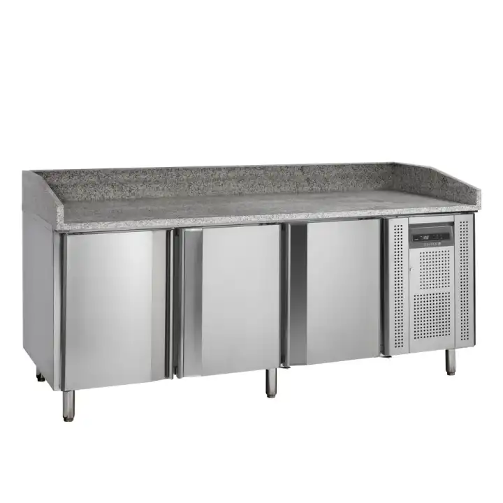 A gama de mesas de pizza PT é fabricada em aço inoxidável SS304. Tem um tampo em granito, ideal para a confeção de pizzas, uma vez que se mantém fresco e dificulta a aderência da massa. Estão disponíveis em vários tamanhos, com 2 ou 3 portas. Também é possível personalizá-las com gavetas. Disponíveis com ou sem porta-condimentos para bandejas GN1/3 os porta-condimentos também podem ser adicionados posteriormente.