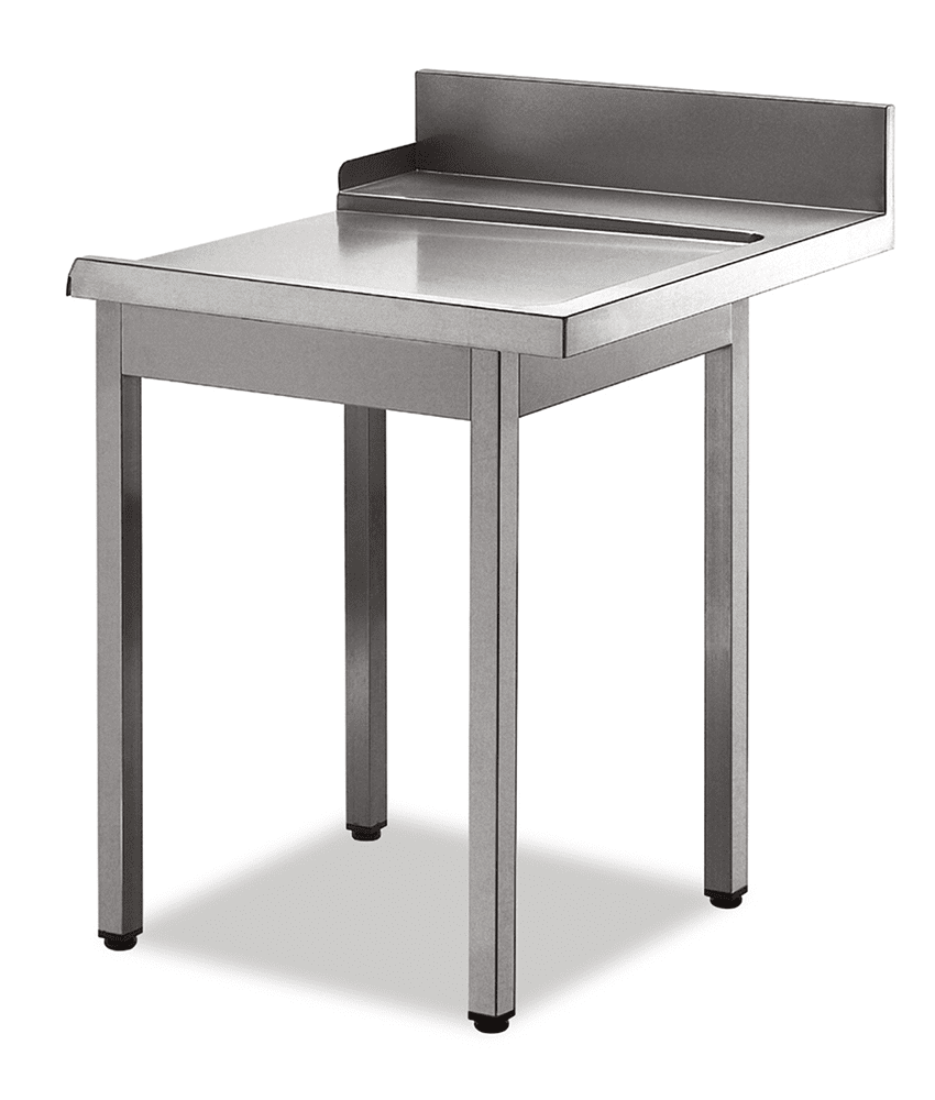 Mesa de saída em aço inox AISI 304, com alçado posterior e prateleira inferior.