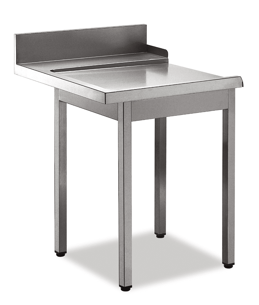 Mesa de saída em aço inox AISI 304, com alçado posterior e prateleira inferior.