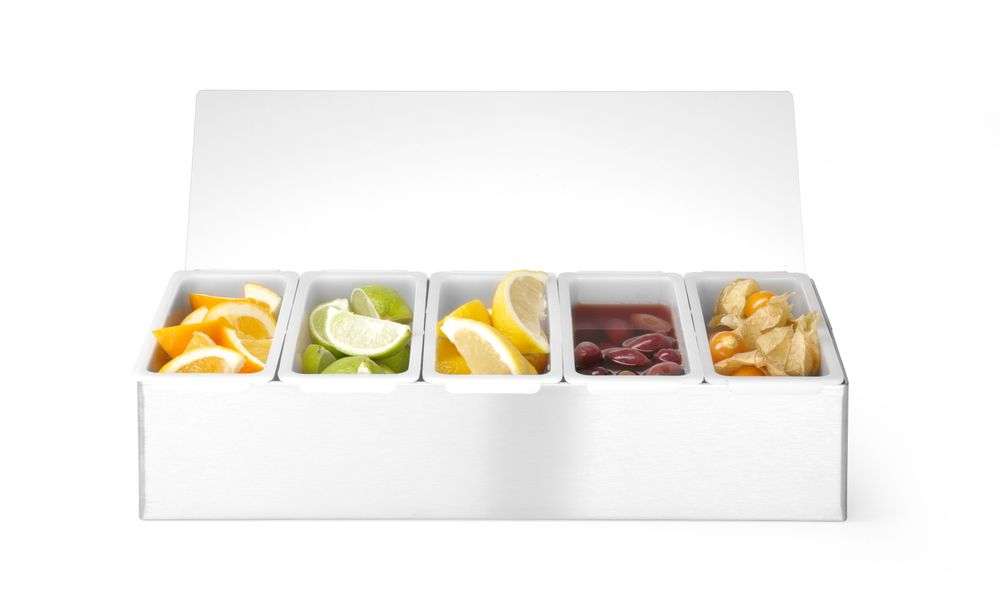Recipientes de armazenamento em polipropileno para uma armazenagem separada de aditivos ou especiarias. Os recipientes podem ser facilmente retirados do suporte.