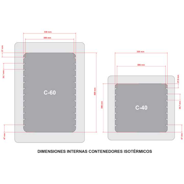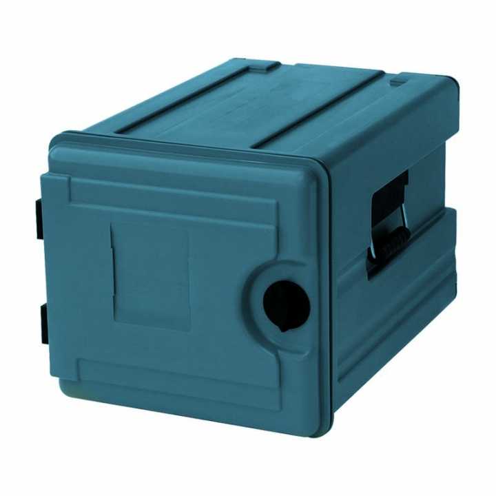 Contêiner C-60: Recipiente isotérmico com porta de carregamento frontal. Capacidade: 12 pares de guias GN 1/1 ou subdivisões. Várias combinações. Capacidade entre 56 e 63 litros.