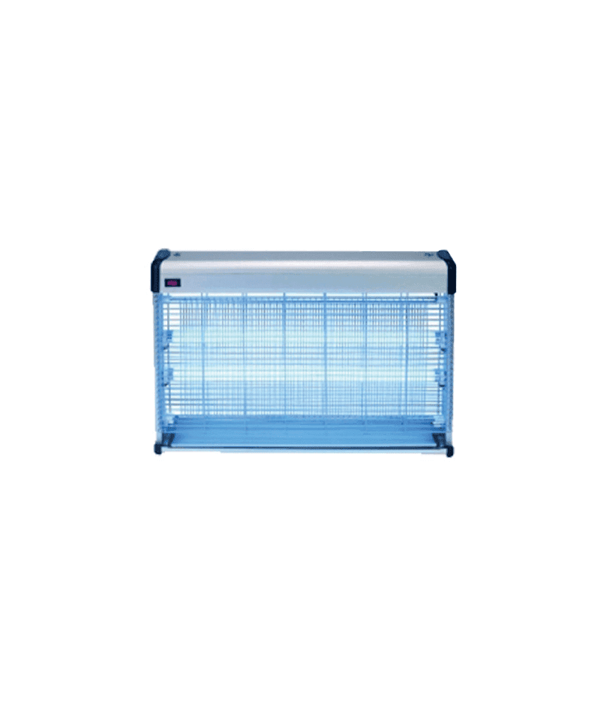 Captador de insectos para zonas públicas com lâmpadas eletrocutores e construção em alumínio. Dotado com grelha exterior para impossibilitar as pessoas de tocarem nas lâmpadas.