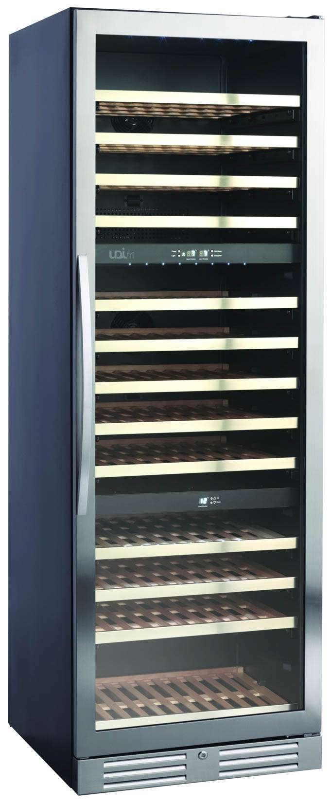 Cave de vinho de cor preta. Com porta e puxador em aço inox. Três zonas de temperatura (+5º/+18ºC), (+5º/+10ºC), (+10º/+18ºC). Refrigeração ventilada. Iluminação interior Led. Com display electrónico. Com fechadura.