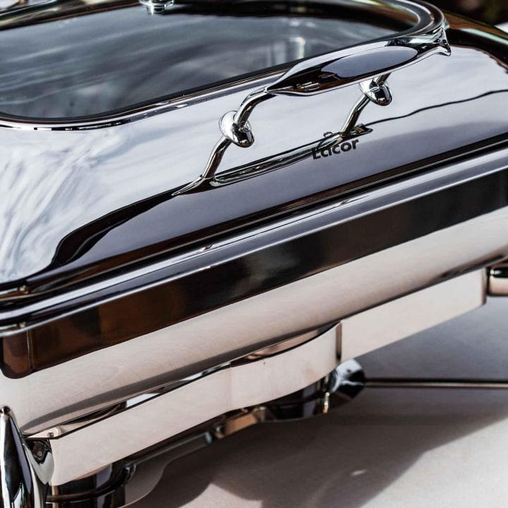 A gama de LUXE Chafing Dish é projetado especialmente para os profissionais da cozinha, tanto na hotelaria, restauração, buffets e grandes celebrações e eventos, onde manter a temperatura dos alimentos que vão servir os clientes é de suma importância. A gama LUXE é fabricada em aço inoxidável 18/10 de alta qualidade que oferece uma garantia máxima em relação à resistência, durabilidade e higiene.