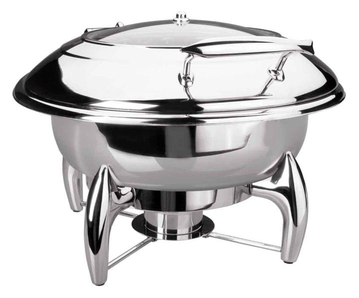 Chafing Dish redondo gama Luxe fabricado em aço inoxidável 18/10 de alta qualidade e excelente resistência à corrosão. Ideal para hotelaria e buffets.