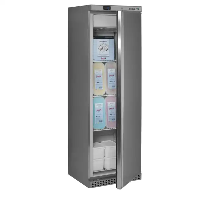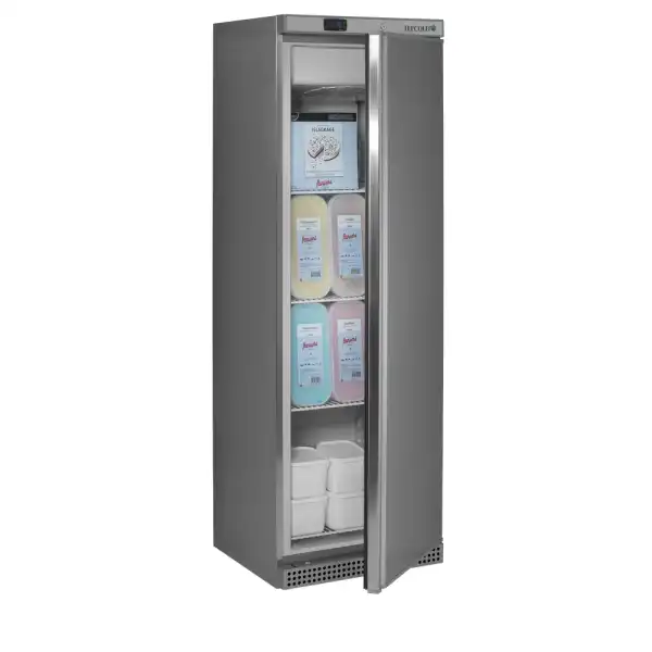 A gama de congeladores UF-VS é a versão assistida por ventilador da nossa gama de congeladores de armazenamento em aço inoxidável. Está disponível em vários tamanhos. Este congelador possui um eficiente sistema de arrefecimento assistido por ventoinha que assegura uma temperatura uniforme em todo o armário. A temperatura é definida no ecrã do termóstato digital fácil de utilizar. Pode personalizar o congelador de acordo com as suas necessidades com prateleiras ajustáveis.