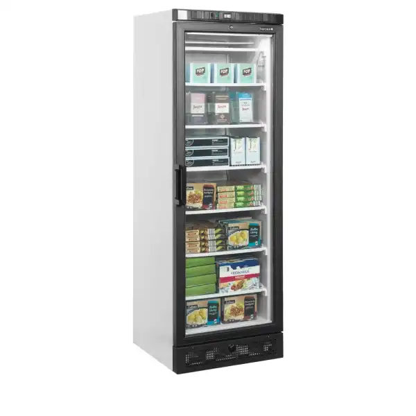A gama de congeladores de exposição UFSC oferece uma excelente apresentação dos produtos e preços competitivos. Possui uma porta de vidro aquecida para evitar a condensação e um dreno de descongelação para facilitar a manutenção. Possui refrigeração estática e prateleiras de congelação fixas com serpentinas de evaporação integradas para garantir uma temperatura uniforme em todo o armário. Este expositor congelador está disponível em preto e branco, com ou sem cobertura iluminada.