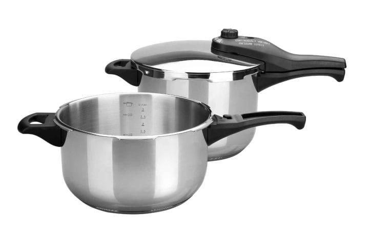 Panelas express em aço inoxidável 18/10 de alta qualidade que oferece excelente resistência à corrosão e aos ácidos alimentares e sais.