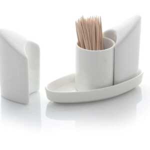 Conjunto com 3 peças: sal, pimenta, suporte para palitos.