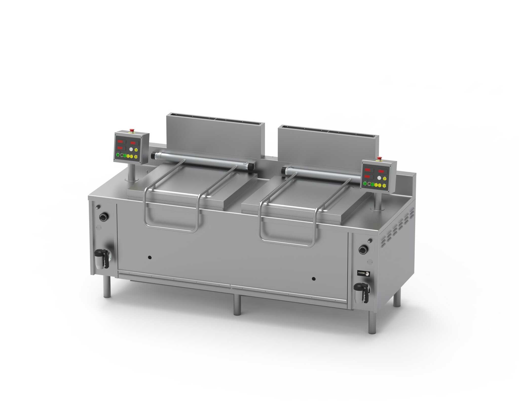-Cuba totalmente em aço inoxidável AISI 316 acetinado. – Cestos de aço inoxidável AISI 316 acetinado. – Escoadouro e torneira para saída e descarga. – Tampa de aço inoxidável AISI 304 com espessura 15/10, equipado com cremalheira de aço com pré-carga das molas e pega atérmica. – Manómetro para o controlo da pressão no interior da parede dupla. – Válvula manual para escape de ar para a despressurização da parede dupla que se produz na fase de aquecimento. – Misturador orientável de bronze cromado com água quente e fria. – Válvula de segurança de peso calibrada a 0,5 bar. – Estrutura forte em aço inoxidável com espessura de 20/10 sobre pés de aço reguláveis de 150mm a 180mm. – Paredes externas de aço inoxidável AISI 304 acetinado com espessura de 10/10. – Estante acetinada em aço inoxidável AISI 304 com espessura 15/10. – Equipada com controlos digitais com 3 displays de 4 algarismos que permitem configurar os valores de temperatura de 20°C a 110°C. – Possibilidade de configurar o tempo de cocção entendido como tempo de imersão do cesto com intervalo mínimo de 1 segundo. – Indicador acústico luminoso para aviso de final de ciclo de cocção. – Bloqueio da cocção com reintegração de água temporizado no final da cocção. – Elevação do cesto automático no final da cocção. – Possibilidade de regulação da posição da cesta: primeiro gotejamento e descarga ou descarga direta frontal.