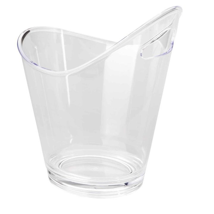 Cubo duplo de 4,5 litros de capacidade para picar gelo e deixe esfriar garrafas. Fabricado em plástico acrílico resistente e transparente. Asa incorporada.