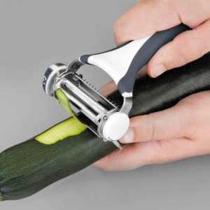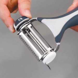 Descascador tipo “E” de 20 cm de comprimento, com 3 lâminas rotativas de aço inoxidável 18/10 de alta qualidade e resistência à corrosão.