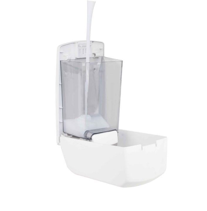 Dispensador de sabonete ou gel hidroalcohólico fabricado em ABS branco com depósito extraível de 1,1 litros de capacidade.