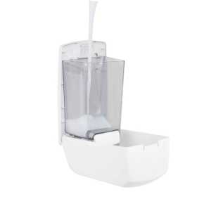 Dispensador de sabonete ou gel hidroalcohólico fabricado em ABS branco com depósito extraível de 1,1 litros de capacidade.