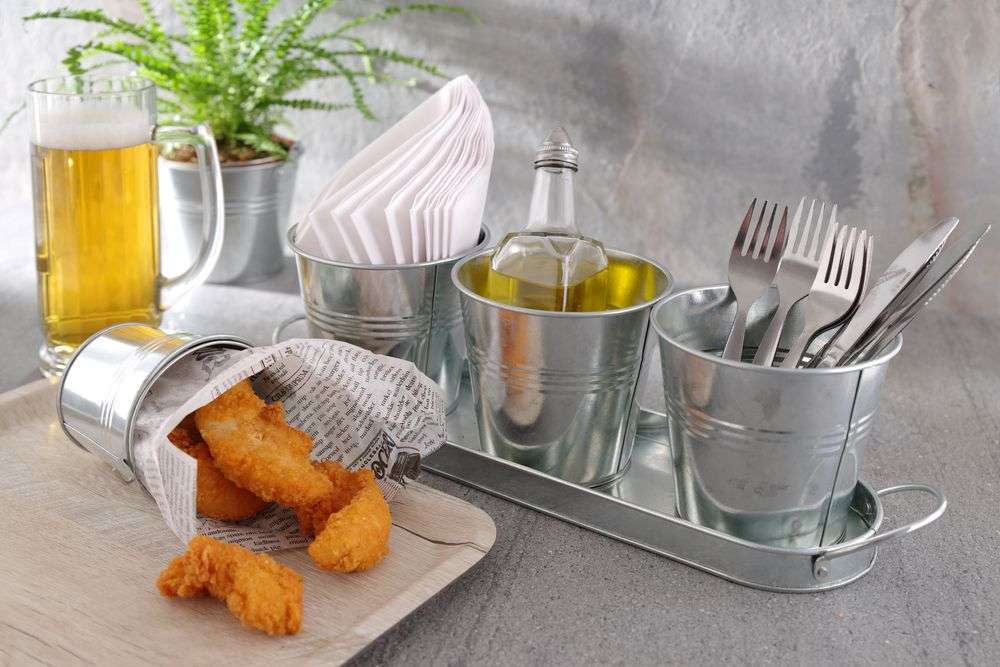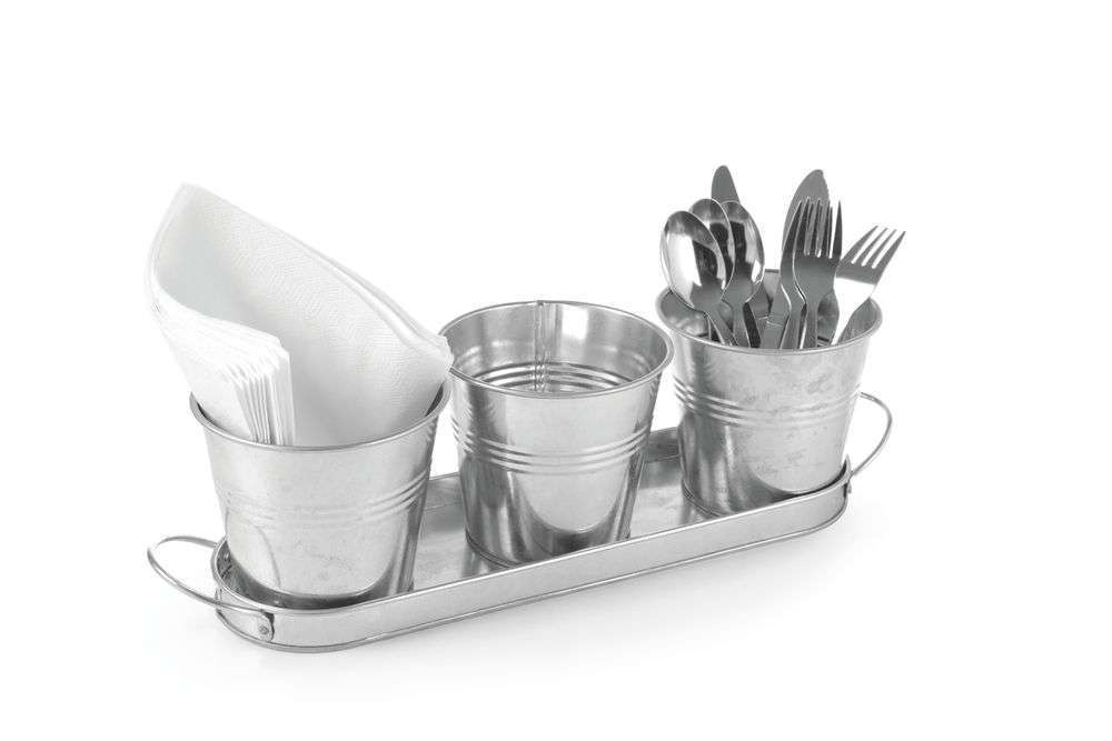 Display – 3 baldes com tabuleiro da é um conjunto útil em estilo rústico feito de chapa de aço galvanizado.