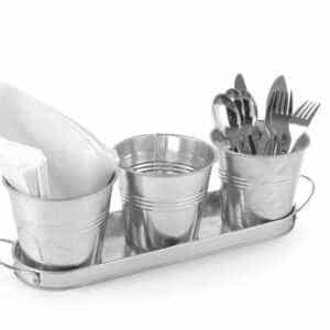Display – 3 baldes com tabuleiro da é um conjunto útil em estilo rústico feito de chapa de aço galvanizado.