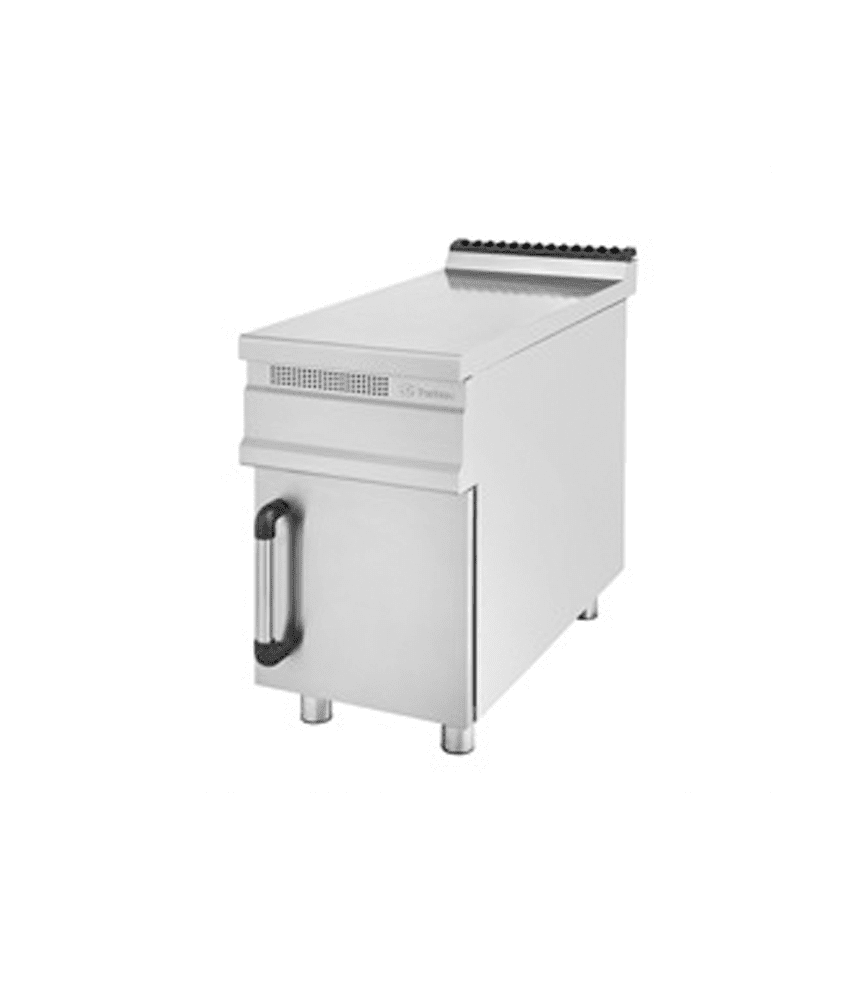 Elemento neutro de apoio com estrutura em aço inoxidável, base inferior com porta de abrir, puxador e pés reguláveis em altura.