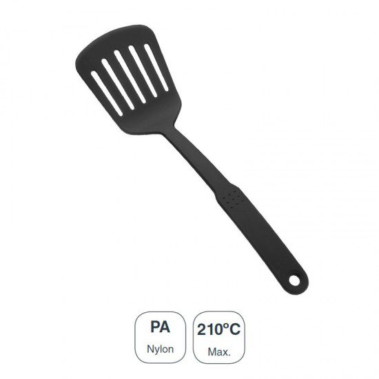 SKU: LA98906Espátula perfurada para cozinha da Série Black fabricada em nylon para temperaturas de cozido até 210ºC. Medidas: 32x9x4 cm