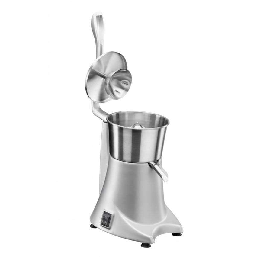 Espremedor elétrico com alavanca de liga de alumínio acetinado – ON/ OFF por meio de alavanca para segurar o recipiente de frutas, filtro, cone e protetor contra respingos, aço inoxidável removível.