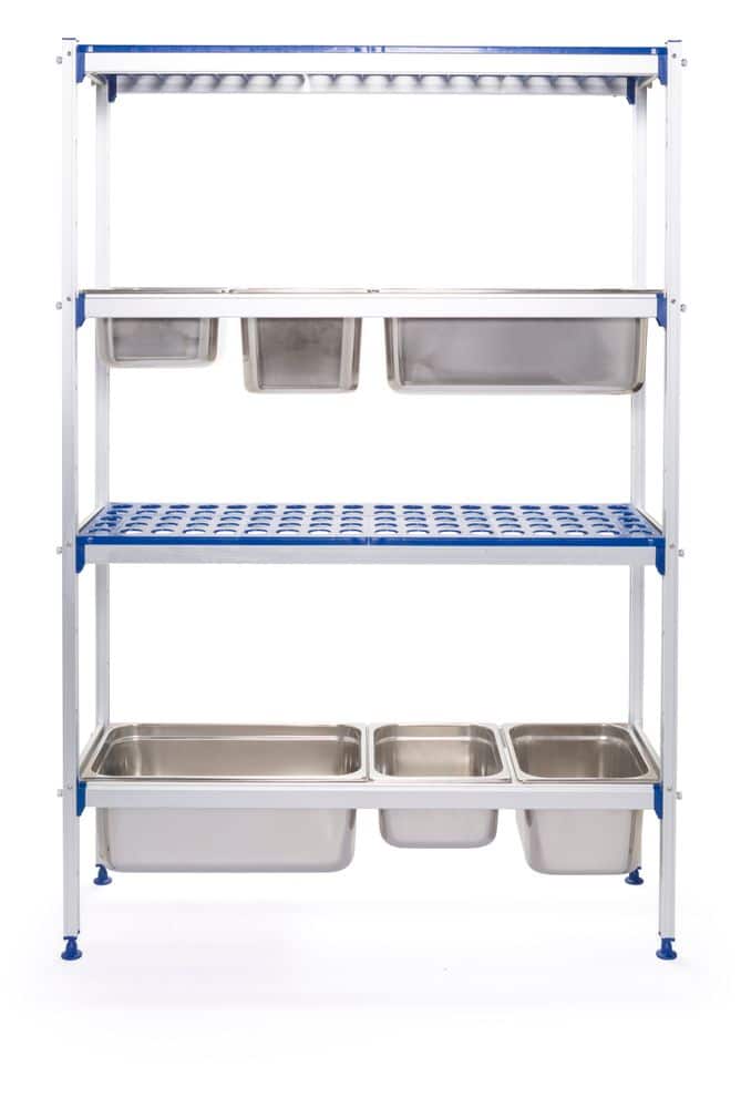 Os recipientes GN 1/1 encaixam diretamente entre os suportes de alumínio.