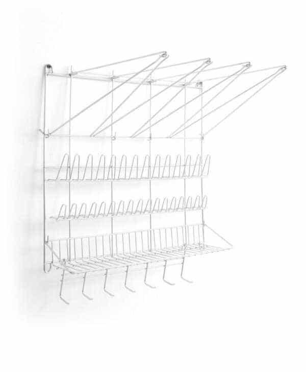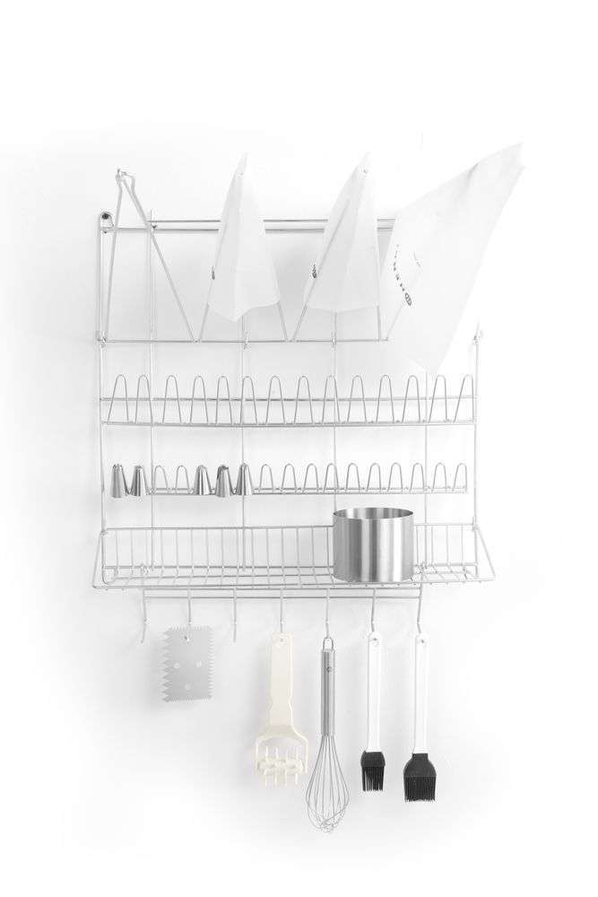 7 ganchos para pendurar utensílios como espátulas e uma pequena prateleira para acessórios pequenos.