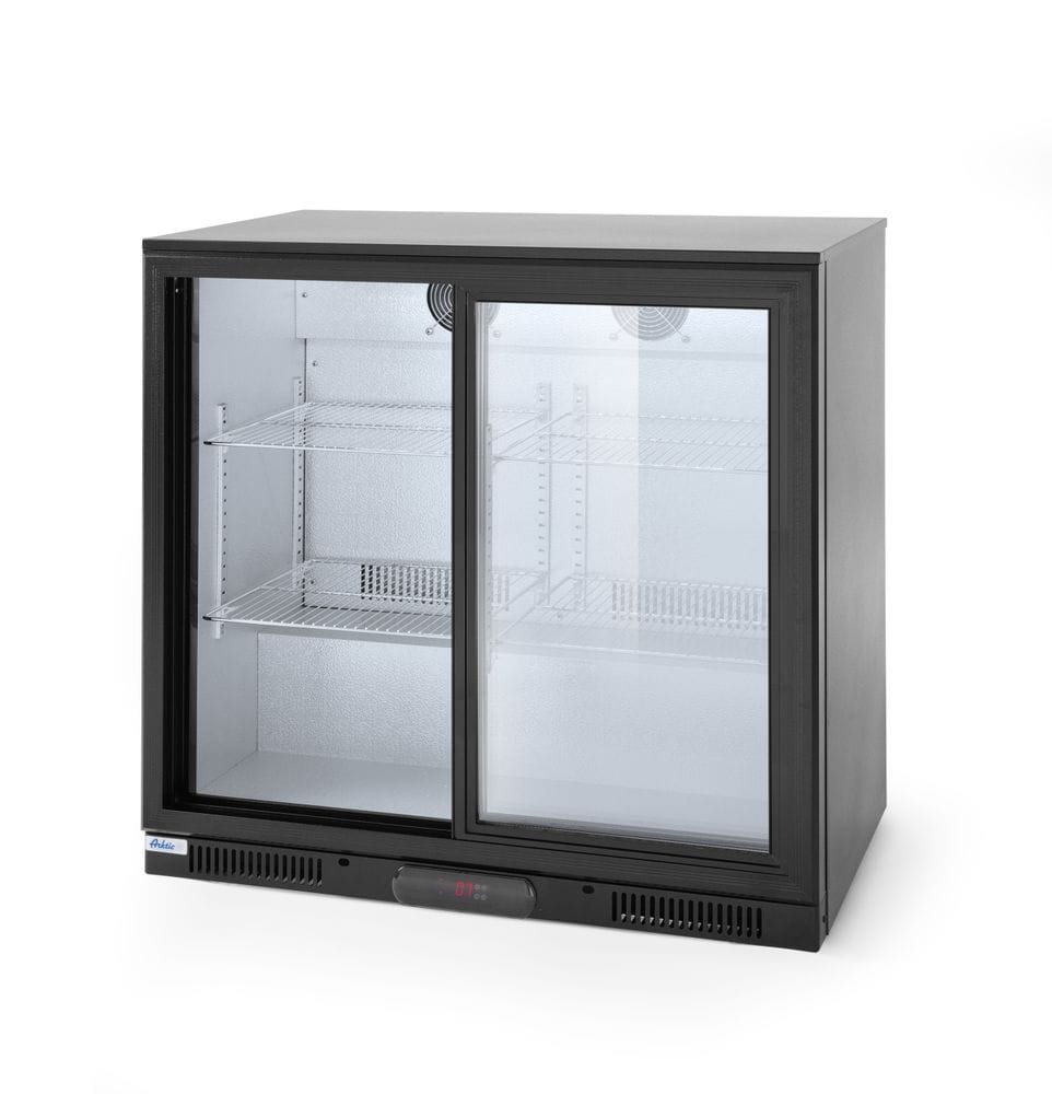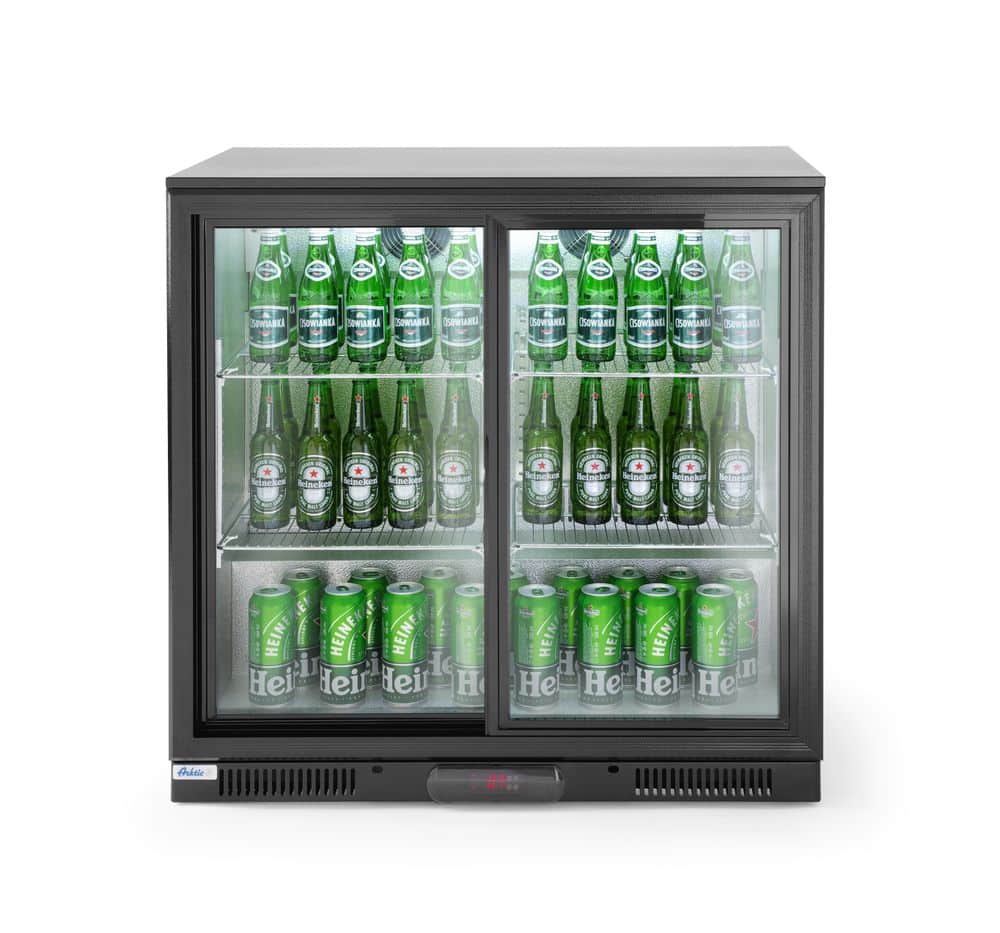 Estrutura lacada, câmara em alumínio embutida, porta(s) de plástico e vidro temperado, passíveis de serem trancadas.