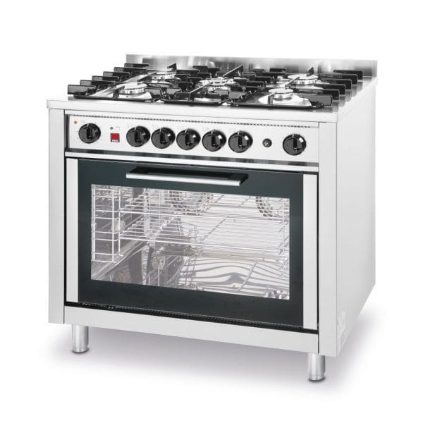 Forno de convecção 1/1 GN com capacidade de 2,7 kW equipado com dois ventiladores, termóstato até 275°C e temporizador.