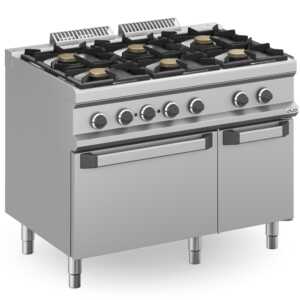 A câmara de cozedura do forno é em aço inoxidável com fundo esmaltado e a porta, também em aço inoxidável, possui parede dupla com cavidade isolante