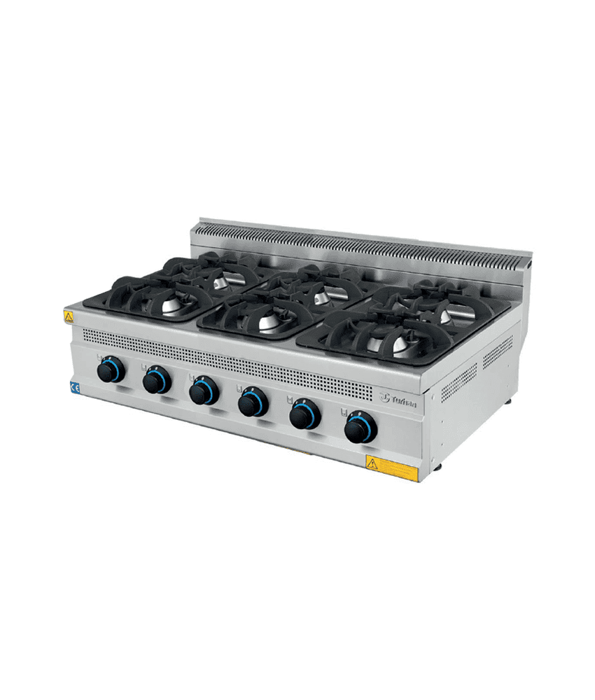 Fogão a gás de 6 queimadores de bancada com estrutura em aço inox, pés niveladores e grelhas em ferro fundido.