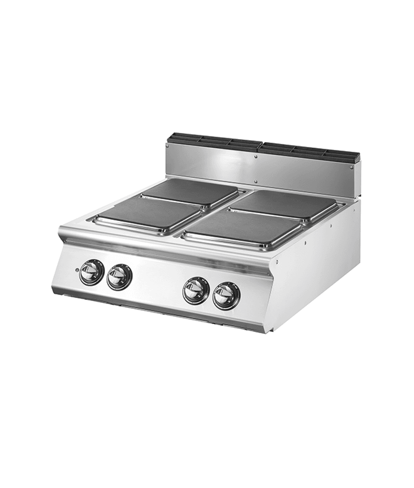 Fogão elétrico de bancada com 4 placas quadradas de aquecimento.