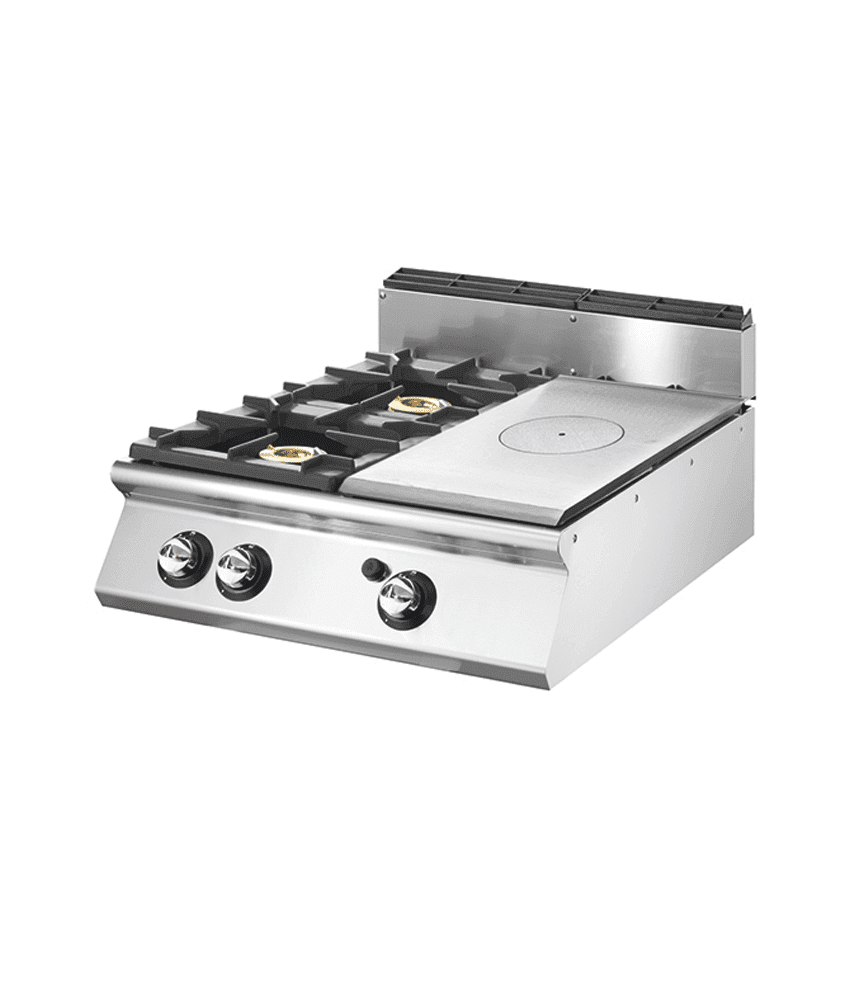 Fogão a gás de bancada com 2 queimadores e placa radiante.
