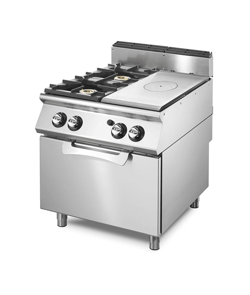 Fogão a gás com 2 queimadores, placa radiante e forno.
